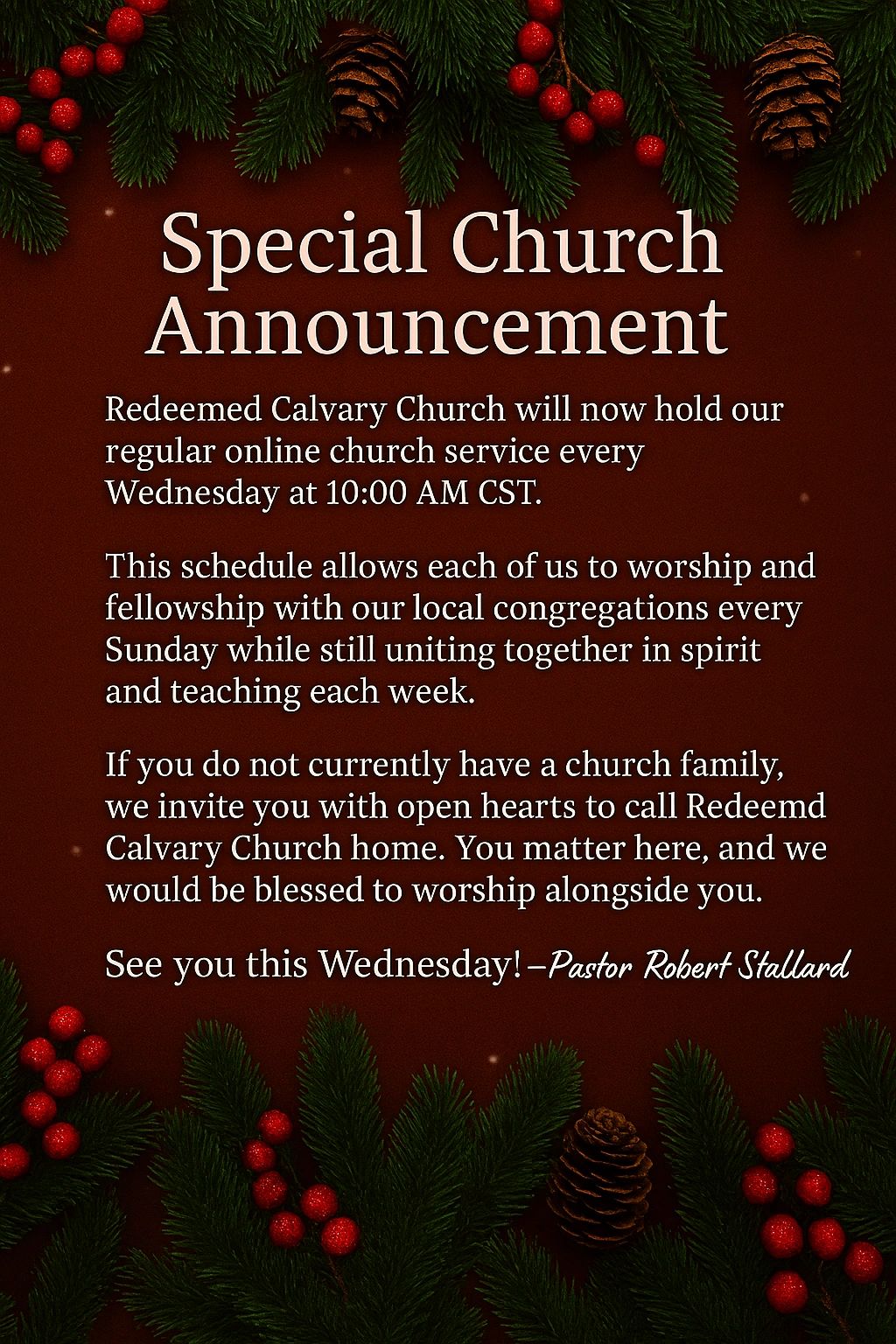 At Redeemed Calvary Church, we invite you and your family to draw closer to God, be refreshed in His presence, and rediscover the true meaning of Christmas. No matter where you are in life, you are welcome here. May the light of Christ fill your heart and home this season.